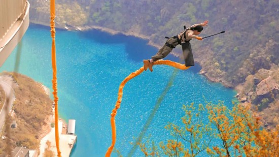 站在崖邊的蹦極台上