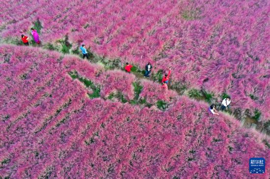 10月8日,游客在河南省许昌市清潩河畔粉黛乱子草园游玩拍照。