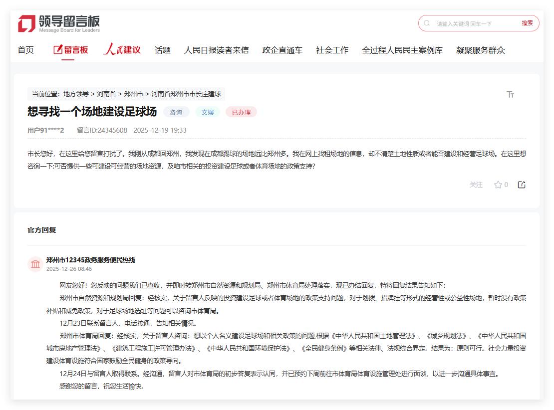 于是,他通过人民网“领导留言板”留言:想投资建设足球或者体育场地,希望得到建设经营场地的资源和相关政策支持。